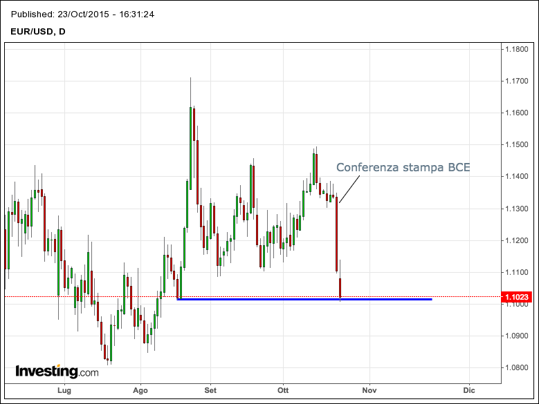 Come noi di forexguida.com vi avevamo già anticipato in uno dei nostri articoli precedenti, le conseguenze della conferenza tenuta dal Presidente della Banca Centrale Europea Mario Draghi, subito dopo la riunione del Consiglio Direttivo della BCE tenutasi a Malta ieri 22 Ottobre 2015, sono state davvero oltre le aspettative. La tendenza ad un ribasso si era già intuita da giorni tra analisti ed investitori, l’unico fattore mancante era proprio la dimensione di questo aspettato ribasso: cosa non facilmente quantificabile. Infatti la realtà ha superato le aspettative e di gran lunga.