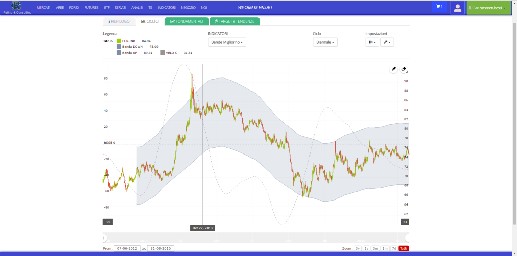 Le bande in figura rappresentano i punti di svolta del mercato, nel caso specifico ci troviamo di fronte ad una conferma del fatto che viviamo un periodo di lateralizzazione. La velocità del sottociclo (annuale hours) si trova sotto all’ asse dello 0, questo significa che tale ciclo è in fase di ribasso pertanto i prezzi dovrebbero arrivare a toccare la banda inferiore prima di ripartire.
